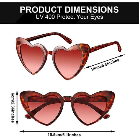 Dimension des lunettes de soleil : les verres mesurent env. 5,3 cm/ 2,1 pouces de largeur et 4,4 cm/ 1,7 pouces de hauteur, le pont de lunettes mesure environ 2,1 cm/ 0,83 pouces, les pieds des lunettes mesurent environ 14 cm/ 5,5 pouces, taille appropriée pour la plupart des gens Le forfait comprend: 9 paires de coeur les lunettes de soleil en forme sont suffisantes pour votre usage quotidien, vous pouvez également les partager avec vos bons amis et les membres de votre famille Design mignon : ces lunettes de soleil sont conçues en forme de cœur, vous pouvez les porter lors de vos achats et de vos voyages, également adaptées à la décoration quotidienne, vous plus élégantes et attrayantes. Assortissez vos vêtements : ces lunettes de soleil en forme de cœur sont de couleur accrocheuse, vous pouvez les choisir pour les assortir à vos tenues selon vos préférences. Cadeau exquis : ces lunettes de soleil en forme de cœur peuvent être appliquées comme cadeau pour vos sœurs, épouse, mère, pratique et exquise, donnez-leur un look différent et rendez-les heureux