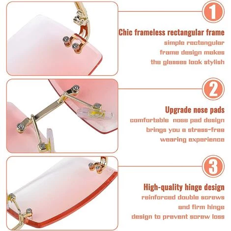 CONTENU DE L’EMBALLAGE : Vous recevrez 4 paires de lunettes de soleil rectangulaires sans monture en 4 couleurs vives : gris, thé, rose, bleu-rose, 4 chiffons à lunettes, 4 sacs à lunettes, assez pour répondre à votre demande de décoration quotidienne et vous pouvez également les partager avec votre amis et famille. Taille appropriée : la largeur totale des lunettes de soleil à monture métallique est d’environ 140 mm/5,5 pouces, et les branches mesurent environ 150 mm/5,9 pouces de long. La largeur totale de la lentille unique est d’environ 58 mm/2,28 pouces et la hauteur est de 38 mm/1,5 pouces. La plaquette nasale des lunettes de soleil mesure environ 10 mm/0,4 pouce. Taille unique pour la plupart des gens. MATÉRIEL SÛR: Les lunettes de soleil rétro transparentes sont fabriquées en résine de qualité, avec un coussinet nasal confortable et des branches en métal, stables et difficiles à casser, peuvent vous servir pendant longtemps, vous apportant une expérience de port confortable. Design chic : la monture sans monture et les branches métalliques délicates donnent aux lunettes de soleil un look très élégant et une sensation de luxe. Il existe différentes jolies lunettes de soleil aux couleurs de bonbons pour que vous puissiez les assortir aux tenues. Plusieurs couleurs pour vos besoins quotidiens en matière de décoration. PRATIQUE ET BEAU: Les lunettes de soleil rectangulaires sont un bon choix pour la mode et l’accessoire quotidien, peuvent être appliquées pour la marche, le shopping, les voyages, la prise de photos, les rencontres, les mariages et autres occasions, des lunettes délicates peuvent vous aider à attirer facilement l’attention des gens.