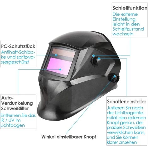 Informations sur le produit Assombrir: (clair -> foncé) <1/30000 s Délai: 0,15 à 0,8 s. Réglable Température de fonctionnement optimale: -5 ° C à 55 ° C Légèrement atténué, conformément à: DIN 4 Noir intense, conforme à: DIN 9-13 (réglable) Protection UV / IR: DIN 16 Matériau: PP (réfractaire) Alimentation: pile solaire, 1 pile au lithium Livraison: casque de soudage solaire, manuel d’utilisation Champ de vision: 96mm x 48mm Poids: environ 490 grammes Poids (emballage compris): 910g