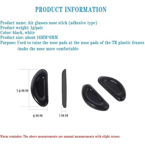 【APPLICATIONS】 Il suffit de mettre ces plaquettes de nez sur les lunettes, des plaquettes de nez en silicone transparent de 1 mm peuvent augmenter l’espace entre le nez et la monture des lunettes. Réduisez la pression initiale que la monture exerce sur le nez pour éviter les marques rouges. En même temps, les lunettes ne glissent pas, ce qui rend la monture plus confortable à porter.
