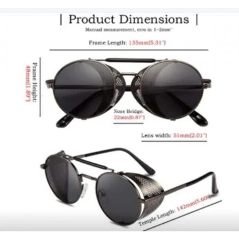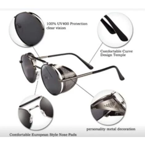 La forme steampunk, la monture en métal haut de gamme et le savoir-faire exceptionnel garantissent la beauté et la qualité de ces lunettes de soleil. Les coques latérales élégantes et les verres colorés de ces lunettes de soleil rondes steampunk sont parfaites pour ceux qui préfèrent un design hippie tendance ou rétro et s’adapteront à toutes les tenues.