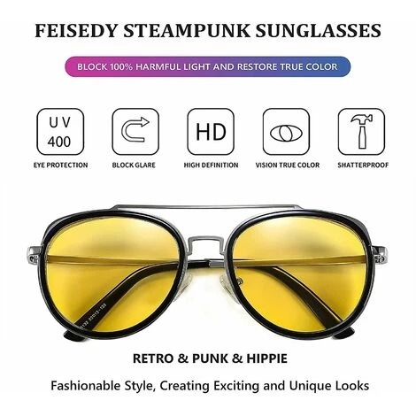 Lentilles en plastique à monture noire Revêtement de protection UV non polarisé Largeur de la lentille : 52 mm Pont : 21 mm Lunettes de soleil FEISEDY STEAMPUNK – Design rétro punk classique, classique et élégant. La conception du double pont de nez renforce le sens du luxe et de la texture des verres. Avec cadre en métal créatif, rétro et rock. Lentilles de couleur océan élégantes – Diverses lentilles colorées voient le monde au-delà de votre imagination, ajoutent différentes couleurs à votre monde et présentent un monde coloré. Pour vous offrir une apparence unique, pour être la plus belle personne de la foule. PROTECTION UV400 – Bloque à 100% les rayons UVA et UVB nocifs, restaure la vraie couleur, élimine la lumière réfléchie et diffusée, offre une vision confortable et protège les yeux. Dimensions du produit Largeur de l’objectif : 52 mm (2,05 ») | Hauteur du cadre : 51 mm (2,01 ») | Largeur du cadre : 140 mm (5,51 ») | Pont de nez : 21 mm (0,83 ») | Longueur des jambes : 132 mm (5,20 »)). Les lunettes de soleil FEISEDY AVIATOR conviennent à toutes les formes de visage, confortables à porter et libres de respirer. C’est le produit parfait, raffiné et intemporel. Il convient aux activités intérieures et extérieures telles que le shopping, la conduite, les voyages et la prise de photos. La monture en métal est ultra-légère, de haute qualité, légère et confortable à porter. Ainsi que faire du shopping, conduire, voyager, prendre des photos et d’autres activités de plein air. La monture en métal est ultra-légère, haut de gamme, légère et agréable à porter.