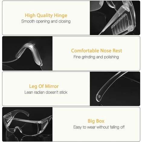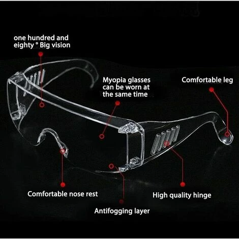 Résistance aux chocs : les lunettes de sécurité transparentes avec lentilles en polycarbonate sont très résistantes aux chocs, un matériau robuste et flexible les rend difficiles à casser, doux et flexibles à porter ; en outre, il y a beaucoup de place à l’intérieur des lunettes pour que vous puissiez porter d’autres types de lunettes.