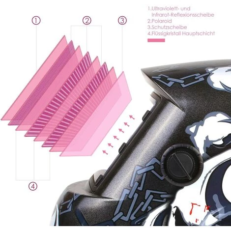 - Assombrissement léger selon DIN 4, fort assombrissement selon DIN 9-13 (réglable).Protection UV / IR: DIN 16, champ de vision: 96mm x 48mm; Matériel: PP