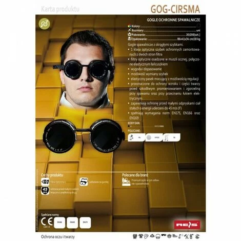 Lunettes de soudage rondes_x000D_Lunettes de soudage à verres ronds._x000D_1ère classe optique de lentilles de protection montées des deux côtés du filtre_x000D_filtres optiques intégrés dans l’œilleton, reliés par une chaîne flexible_x000D_confort et ajustement_x000D_la possibilité de remplacer les lentilles_x000D_sangle élastique et réglable_x000D_conçu pour protéger les yeux et les parties du visage contre les rayonnements nocifs et le tartre pendant le soudage et le coupage à l’arc électrique_x000D_offrent une protection contre les petites éclaboussures de solides avec une énergie d’impact allant jusqu’à 45 m / s (F)_x000D_répondre aux exigences des normes EN175, EN166 et EN169_x000D_Propriétés_x000D_classe optique 1_x000D_mettre un élastique_x000D_protection contre les petits corps volant à des vitesses allant jusqu’à 45 m / s_x000D_Le produit est recommandé pour les industries_x000D_Industrie lourde, y compris les fonderies et le soudage_x000D_Vêtements de travail et SST, articles SST