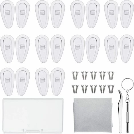 Le forfait comprend : 10 paires de plaquettes nasales en silicone, 10 paires de vis, 1 tournevis, 1 pince à épiler, 1 chiffon de nettoyage, 1 boîte en plastique.