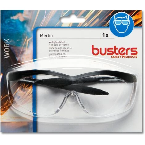 Ces lunettes de sécurité de Busters ont des verres en polycarbonate transparent avec un revêtement dur spécial. Ils vous protègent contre les impacts de particules à grande vitesse, catégorie F : impact à faible énergie. Les rayons UV sont absorbés à 99,9%. La monture est en nylon et possède des boucles d’oreilles droites et des embouts souples.