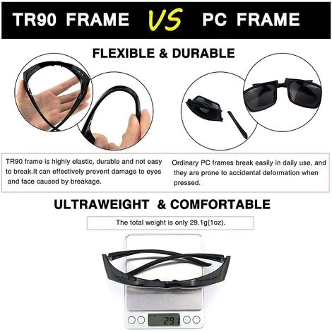 TR90 Frame Tri-Acetate Cellulose Lens Polarized Mirror Coating Coating Largeur de la lentille : 2,3 pouces Hauteur de la lentille : 39 Pont : 19 millimètres Branche : 134 Porter sur vos lunettes de vue : une paire de lunettes de soleil fonctionnelle et pratique qui fera de vous un conducteur plus sûr , en les enfilant rapidement pendant la conduite sans les tracas des clips. Lorsque vous entrez dans les garages de tunnels et autres endroits sombres, retirez rapidement vos lunettes de soleil. Vous n’êtes pas obligé d’acheter une deuxième paire de lunettes de soleil myope. 【PROTECTION UV 100% NOCIVE】: Vous adorerez la saturation accrue des couleurs, l’amélioration de la clarté de la vision, contre les rayons UV et empêcherez vos yeux d’être exposés à la lumière directe du soleil. Les lunettes de soleil avec verres polarisés et UV400 réduisent l’éblouissement réfléchi par les routes, l’eau, l’eau et d’autres surfaces planes, réduisant la fatigue des lunettes et augmentant la sécurité à l’extérieur. Parfait pour les journées ensoleillées. CADRE TR90 ULTRA LÉGER: Il présente les caractéristiques de légèreté, d’élasticité, de durabilité et ne se casse pas facilement (par rapport aux autres cadres en polycarbonate bon marché), ajoutez les plaquettes de nez et les branches en caoutchouc souple, qui peuvent vous apporter une expérience de port super confortable. 4 COULEURS 2 TAILLES DISPONIBLES: Des lunettes de soleil élégantes conviennent aux hommes et aux femmes. Vous pouvez le porter pendant la conduite, le jogging, la randonnée, le golf, la pêche et le travail ou d’autres activités de plein air et vous serez le centre d’attention. GARANTIE DE REMBOURSEMENT DE 30 JOURS : S’il y a des problèmes qui vous rendent insatisfait, vous pouvez obtenir un remboursement sans condition. Nous ferons de notre mieux pour vous offrir des services premium afin de vous assurer que votre achat est sans risque.