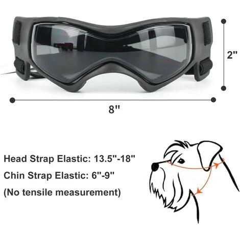 Taille : les lunettes pour chiens conviennent aux Yorkie, Schnauzer, Caniche, Carlin ou aux petits chiens de plus de 10 kg. Élastique de la tête : 34,3 cm à 45 cm, Élastique du menton : 15,2 cm à 22,8 cm (mesure sans étirement) 5,1 cm de haut et 20,3 cm de long.