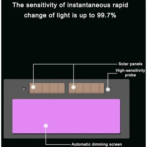 Sonde sensible : une sonde très sensible est utilisée pour la gradation automatique et le masque de soudure. La lumière change plus vite qu’avant. La vue avant soudage est claire et les points de soudage peuvent être enregistrés avec précision. Lors du soudage, l’écran s’assombrit instantanément, filtrant automatiquement la lumière nocive et protégeant efficacement vos yeux.